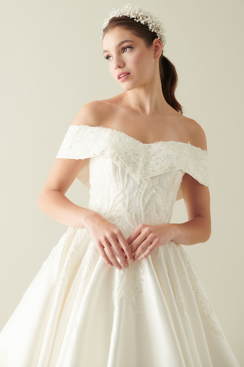 Ziberlin kumaş üzerine bedenden serpilen işlemeli dantelle dizayn edilmiş düşük kollu prenses gelinlik. Tüm ürünler tadilat ile 1 beden büyüyüp küçültülebilmektedir.